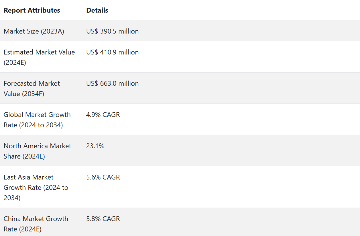미국 시장은 2024년까지 6,580만 달러의 가치를 가지게 될 것이며, 2024년부터 2034년까지 총 4,750만 달러의 절대적인 달러 가치 기회가 있을 것입니다.