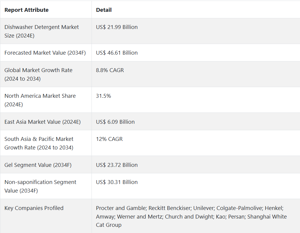 Fact.MR이 발표한 새로운 연구에 따르면, 2024년 세계 식기세척기 세제 시장은 미화 219억 9천만 달러 규모로 분석되었으며, 2034년 말까지 연평균 성장률 8.8%를 기록하며 미화 466억 1천만 달러에 이를 것으로 전망됩니다.