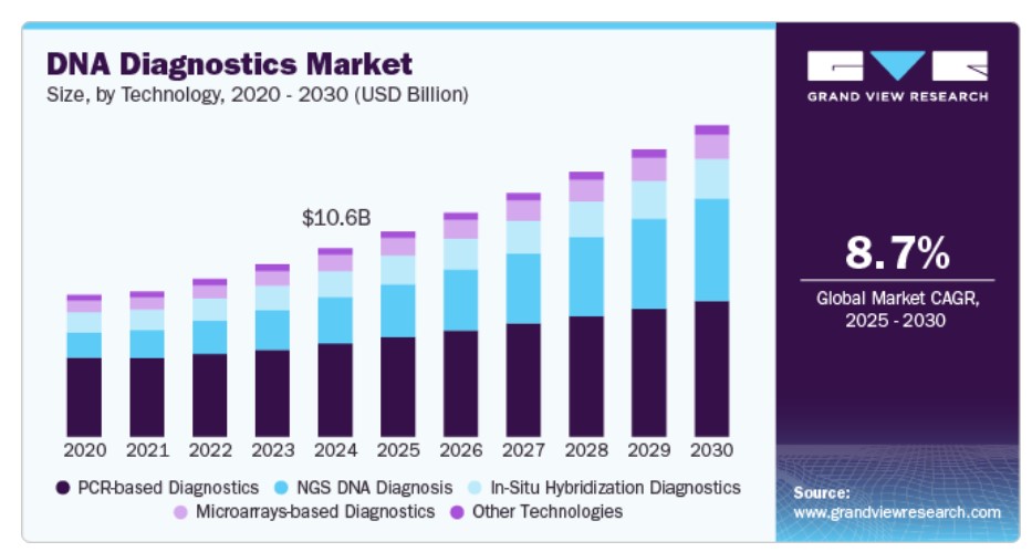 글로벌 DNA 진단 시장은 2024년에 약 106억 1천만 달러로 추정되며, 2025년부터 2030년까지 연평균 8.7% 성장할 것으로 예상됩니다. 이 성장은 유전 질환의 증가, 개인 맞춤형 의약품의 채택, 그리고 진단 기술의 발전에 의해 촉진되고 있습니다. 특히 차세대 염기서열 분석(NGS)과 CRISPR 기술이 진단의 정확성과 효율성을 높이고 있으며, 이를 통해 조기 질병 검출과 다양한 응용 분야에서 수요가 증가하고 있습니다.