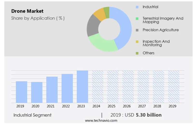 글로벌 드론 시장 : 적용 분야 (산업용, 지상 이미지 및 지도 제작, 정밀 농업, 검사 및 모니터링, 기타), 한국, 아시아, 미국, 2025-2029, 시장 규모