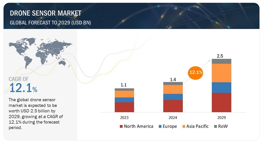 According to MarketsandMarkets, the drone sensor market size is expected to be valued at USD 1.4 billion in 2024. It is anticipated to be USD 2.5 billion by 2029, growing at a CAGR of 12.1% during the forecast period. Factors such as the increasing adoption of drone sensor include increasing demand for precision agriculture, rising adoption in the media industry for event coverage, and expanding applications in military, defense, and energy& utilities sectors.