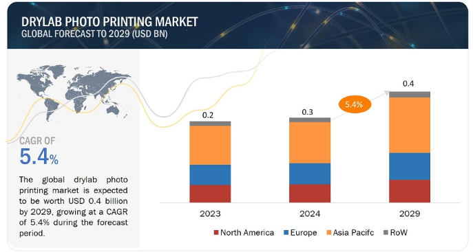 드라이랩 사진 인쇄 시장은 2024년 30억 달러에서 2029년 40억 달러에 달할 것으로 예상되며, 2024-2029년 동안 5.4%의 연평균 성장률(CAGR)을 기록할 것으로 전망됩니다. 사진 인쇄의 최첨단 솔루션인 드라이랩 사진 인쇄 시스템은 열 염료 승화 기술을 활용하여 고품질의 내구성 있는 사진 인쇄물을 생산합니다. 습식 화학 물질을 사용하는 기존 사진 프린터의 기존 방식에서 벗어나 드라이아드 인쇄는 많은 장점을 제공합니다. 여기에는 우수한 인쇄 품질, 빠른 인쇄 속도, 다양한 용지 유형과의 호환성, 다양한 생산 수요를 충족하는 확장성, 운영 효율성, 청결성(습식 화학 물질을 사용하지 않기 때문에), 원활한 기능을 보장하는 사용자 친화적인 인터페이스 등이 포함됩니다.