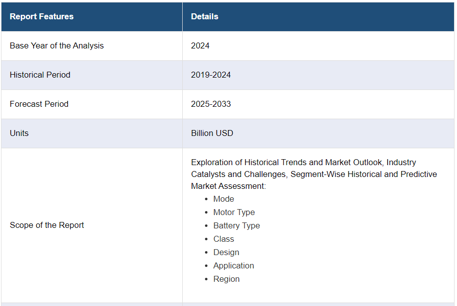 IMARC 그룹은 2025-2033 년 글로벌, 지역 및 국가 수준에서 예측과 함께 글로벌 전자 자전거 시장의 각 부문의 주요 동향에 대한 분석을 제공합니다. 시장은 모드, 모터 유형, 배터리 유형, 등급, 디자인 및 용도에 따라 분류되었습니다.