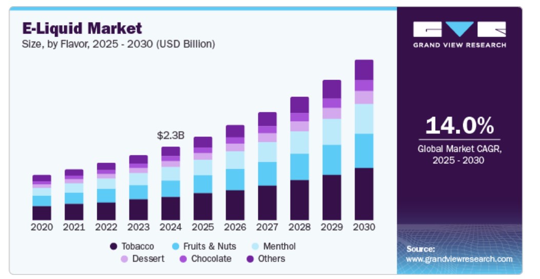 글로벌 전자 액상 시장 규모는 2024년 기준 22억 6천만 달러로 평가되었으며, 2025년부터 2030년까지 연평균 14.0%의 성장률을 보일 것으로 예상됩니다. 점점 더 많은 소비자들이 유해 화학 물질에 대한 노출을 줄이기 위해 전통적인 흡연의 안전한 대안으로 베이핑을 선택하고 있습니다. 또한, 다양한 맛의 베이핑 액상들은 흡연자와 비흡연자 모두에게 어필하고 있습니다. 또한, 온라인 판매와 혁신적인 마케팅 전략을 통해 접근성이 향상되면서 전자 담배의 사용 범위가 더 많은 사람들에게 확대되었습니다.