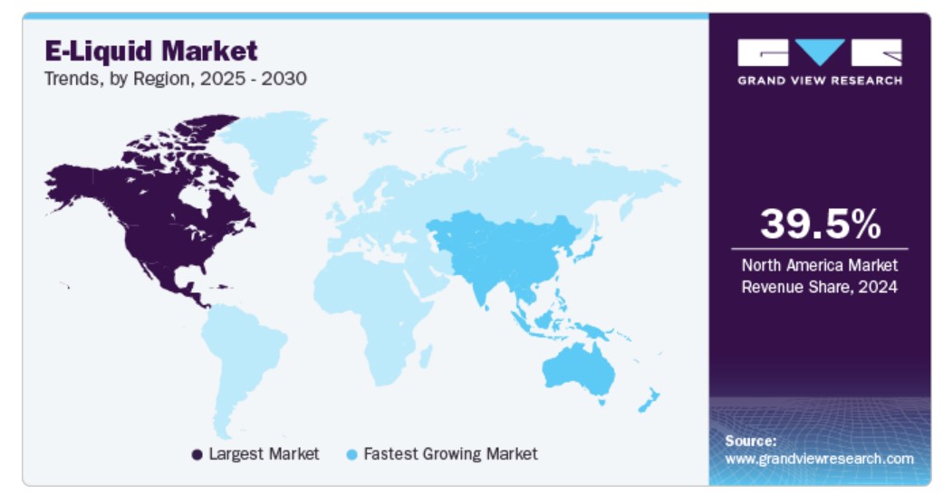 2024년 북미 전자 액상 시장은 39.5%의 매출 점유율로 전 세계 매출을 주도했습니다. 이 지역은 온라인과 소매 판매를 모두 지원하는 강력한 유통 네트워크와 확립된 베이핑 문화를 보유하고 있습니다. 이 지역은 혁신과 제품 차별화에 중점을 두고 다양한 소비자 기반을 충족시키는 주요 업체들의 상당한 투자를 받았습니다. 또한, 미국과 캐나다의 규제 체계는 일반적으로 전자담배 제품을 지원하여 시장 성장을 촉진하고 소비자가 전통적인 담배 제품에서 전자액상으로 전환하도록 장려하고 있습니다.
