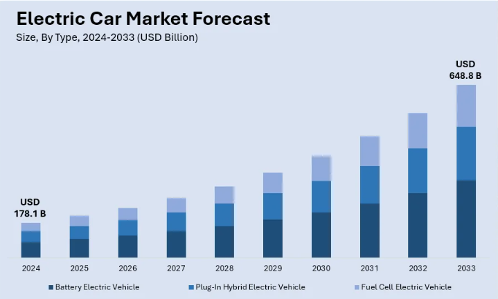 전기 자동차 시장의 성장은 환경에 대한 관심 증가, 기술 발전, 지속 가능한 교통수단을 장려하는 정부 정책에 기인합니다. 전기 자동차(EV)는 배기가스 배출 감소, 화석 연료에 대한 의존도 감소, 운영 비용 절감 등 다양한 이점을 제공하므로 더 많은 소비자와 기업이 전기 자동차를 선택하고 있습니다. 이러한 추세에 부응하기 위해 자동차 제조업체들은 전기차 기술에 많은 투자를 하고 있습니다. 소형 도심형 자동차, 고성능 스포츠카, 전기 SUV 등 소비자의 요구를 충족하기 위해 제품 라인업이 점점 더 다양해지고 있습니다. 배터리 기술의 발전으로 소비자의 주요 관심사인 주행거리와 충전 속도가 크게 향상되어 전기 자동차의 매력은 더욱 높아졌습니다. 소비자들의 관심 외에도 온실가스 감축을 위해 각국 정부가 제공하는 보조금과 세제 혜택으로 인해 전 세계 여러 정부에서 전기차 도입을 추진하고 있습니다. 충전 인프라를 보다 편리하고 쉽게 이용할 수 있도록 공공 및 민간 기관과 함께 충전 인프라를 확대할 필요가 있습니다. 기후 변화에 대한 대중의 인식이 높아지고 기술이 발전함에 따라 전기 자동차 시장은 자동차 부문의 판도를 바꿀 것으로 보입니다. 분석가들은 탄소 중립과 지속 가능한 도시 이동성을 향한 전 세계의 노력 속에서 전기차가 계속 성장하고 그 입지를 공고히 할 것으로 보고 있습니다.
