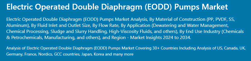 앞서 언급한 사실에 따르면, 시장 조사 및 경쟁 정보 제공 업체인 Fact.MR에 따르면, 전기 작동식 이중 다이어프램(EODD) 펌프 시장은 2024년부터 2034년까지 예측 기간 동안 연평균 8.9%의 성장률을 보일 것으로 예상됩니다.