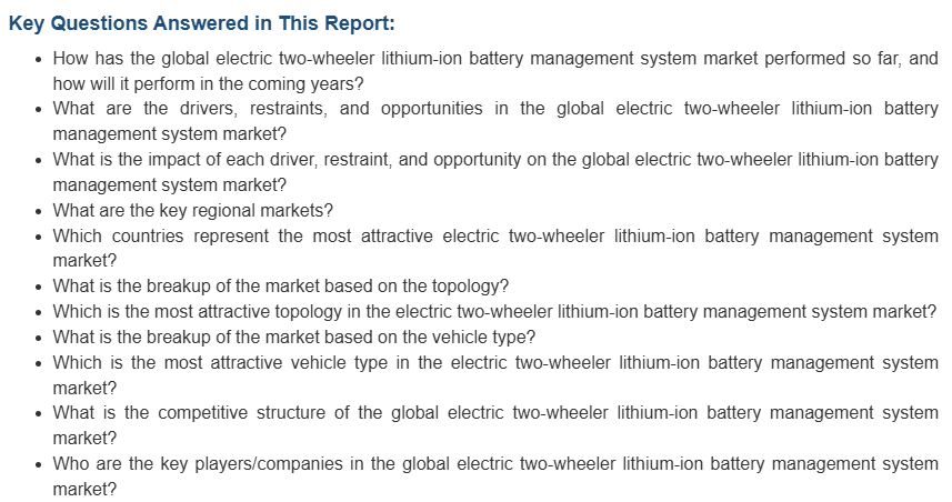 비용 효율성, 유연성, 에너지 효율성, 환경 친화성 등의 이유로 전기 이륜차의 채택이 증가하고 있는 것이 시장 성장을 주도하는 주요 요인 중 하나입니다. 전기 이륜차 리튬이온 BMS는 충전 상태(SoC) 추정, 셀 밸런싱, 온도 관리, 배터리 팩의 과충전, 과방전, 단락 및 기타 안전 위험으로부터 보호 등 다양한 기능을 수행하는 데 널리 사용됩니다. 이 외에도, 경량, 높은 에너지 밀도, 긴 수명, 낮은 자기 방전 특성으로 인해 이륜차용 리튬 이온 배터리 팩에 대한 수요가 증가하는 것도 성장 촉진 요인으로 작용하고 있습니다. 또한, 온실가스(GHG) 배출을 줄이고 환경 오염을 최소화하기 위해 전기 이륜차의 보급을 촉진하기 위한 다양한 정부 이니셔티브의 시행이 시장 성장에 박차를 가하고 있습니다. 또한, 사용자의 주행 패턴과 선호도를 분석하여 배터리 성능을 개선하고 수명을 연장하는 인공지능(AI) 기반 전기 이륜차 리튬이온 BMS의 도입이 시장 성장에 긍정적인 영향을 미치고 있습니다. 이 외에도, 여러 개의 배터리 시스템을 관리할 수 있고, 사용자에게 더 큰 유연성을 제공하며, 보호 기능을 강화하고, 더 빠른 충전 밸런싱 기능을 제공하는 모듈형 BMS에 대한 수요가 증가하면서 시장 성장에 도움이 되고 있습니다. 소비자 지출 능력 증가, 환경에 대한 관심 증가, 첨단 BMS의 연구개발(R&D)에 대한 투자 증가, 다양한 제품 이점에 대한 소비자 인식 증가 등 다른 요인들도 시장 성장을 견인할 것으로 예상됩니다.