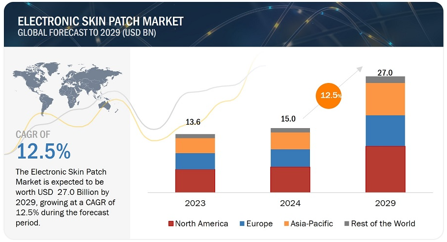 전자 피부 패치 시장은 2024년에 150.0억 달러로 평가되었으며 2029년에는 270.0억 달러에 달할 것으로 예상되며 예측 기간 동안 12.5%의 CAGR을 기록할 것으로 예상됩니다. 시장의 성장은 원격 건강 모니터링 솔루션에 대한 수요 급증, 유연한 전자 제품, 센서 및 무선 기술의 급속한 발전, 조기 질병 발견에 대한 인식 증가, 노인 인구 증가에 의해 주도되고 있습니다.