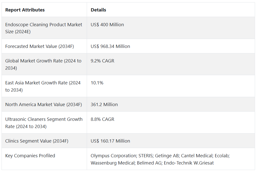 연평균 성장률 9.2%로 성장하는 글로벌 내시경 세척 제품 시장은 2024년 4억 달러에서 2034년 9억 6,834만 달러로 증가할 것으로 예상됩니다.