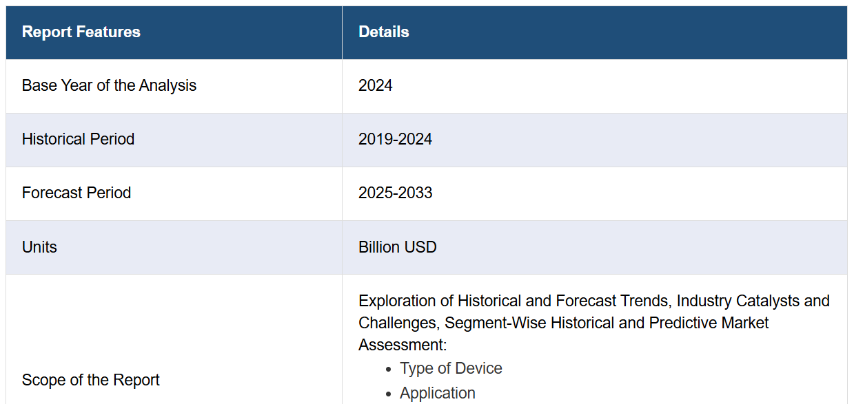 IMARC Group은 시장 각 세그먼트의 주요 동향 분석과 함께 2025-2033년 국가별 전망을 제공합니다. 본 보고서는 기기 유형, 적용 분야, 최종 사용처에 따라 시장을 분류하였습니다.