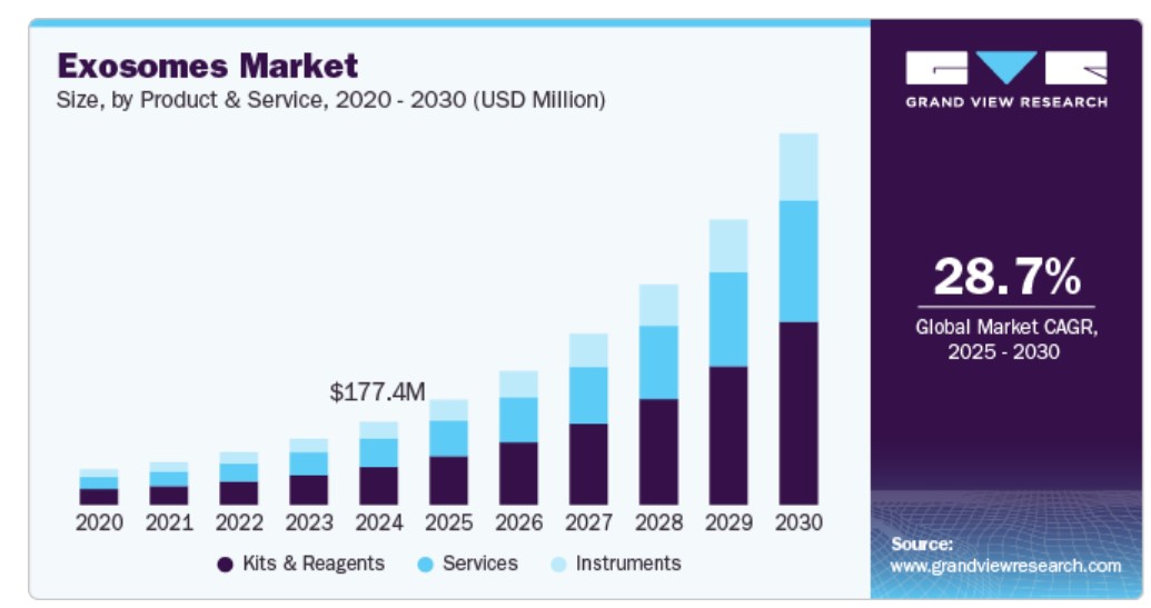 글로벌 엑소좀 시장 규모는 2024년에 미화 1억 7,740만 달러로 추정되었으며, 2025년부터 2030년까지 연평균 28.73%의 성장률을 보일 것으로 예상됩니다. 엑소좀(Extracellular Vesicles, EV)이라고도 불리는 엑소좀은 하나의 외막으로 둘러싸여 있습니다. 엑소좀은 다양한 세포 유형에 의해 분비되며, 소변, 혈장, 타액, 모유, 정액, 뇌척수액(CSF), 기관지액, 양수 등의 체액에 존재합니다. 이 소포는 단백질과 유전 물질을 운반하여 세포 간의 소통을 촉진합니다.