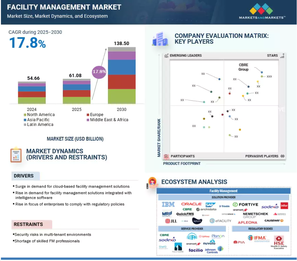 시설 관리 시장은 2025년 USD 61.08억 달러에서 2030년까지 USD 138.50억 달러로 성장할 것으로 예상되며, 예측 기간 동안 연평균 성장률(CAGR)은 17.8%로 전망됩니다. 기업들은 고급 기술과 혁신적인 관행을 통합함으로써 건물을 지능형, 지속 가능하고 효율적인 환경으로 전환할 수 있습니다. 예를 들어, 스마트 빌딩 시스템을 도입하면 HVAC, 조명, 보안 시스템의 실시간 모니터링 및 제어가 가능해져 에너지 사용 최적화와 입주자 편의성 향상을 이끌어냅니다.