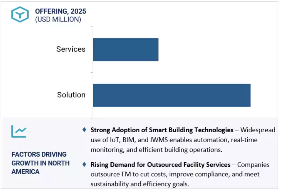 또한 BFSI 기관들은 물리적 자산과 모니터링 시스템을 원활하게 연결하기 위해 디지털 트윈을 도입하고 있습니다. 이는 은행과 보험사가 지점을 원격으로 관리하고 시스템 전체의 운영 일관성을 유지할 수 있도록 합니다. 위험 완화, 운영 효율성, 고객 안전의 융합은 BFSI 기업들이 통합 시설 관리에 대규모 투자를 유도하며, 이 분야를 최대 시설 관리 솔루션 및 서비스 분야로 자리매김하게 하고 있습니다.