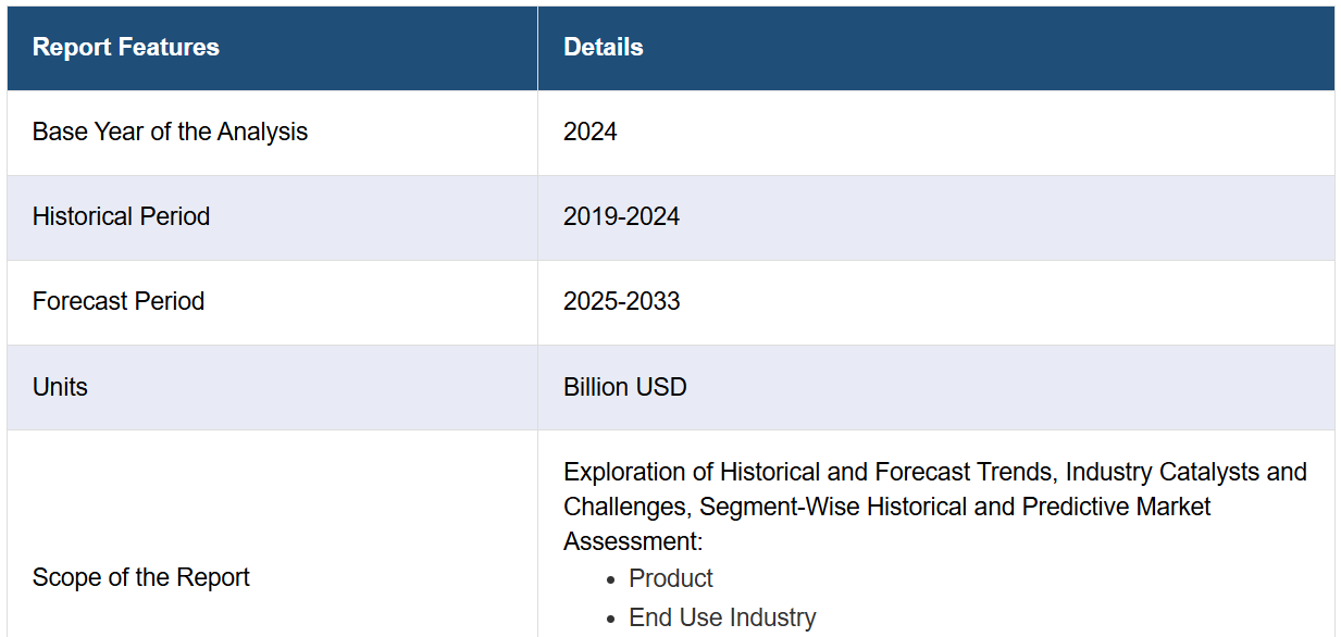 IMARC Group은 시장 각 세그먼트의 주요 동향 분석과 함께 2025-2033년 국가별 전망을 제공합니다. 본 보고서는 제품 및 최종 사용 산업별로 시장을 분류하였습니다.
