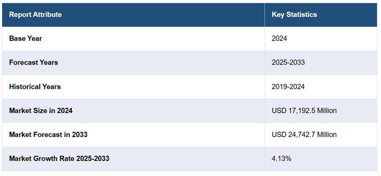 한국 패스트푸드 시장 규모는 2024년 17,192.5 백만 달러 에 달했습니다. 향후 전망으로, IMARC 그룹은 시장이 2033년 24,742.7 백만 달러 에 도달할 것으로 예상하며, 2025-2033년 기간 동안 (연평균 성장률) 4.13% 를 기록할 것으로 전망합니다. 편리하게 접근할 수 있고 빠르게 준비되는 식품 옵션의 채택 증가와 함께, 편리하고 효율적인 식사 솔루션을 찾는 개인 및 가구 수가 증가하는 것이 전국적으로 시장 성장을 주도하는 주요 요인이다.