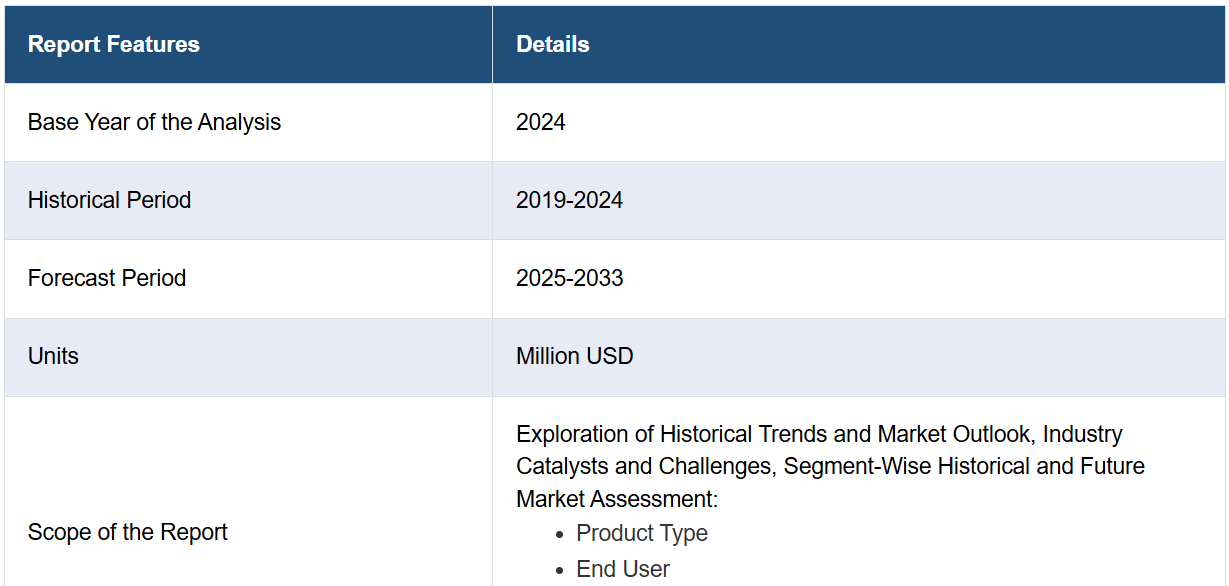 IMARC Group은 시장 각 부문의 주요 동향 분석과 함께 2025-2033년 국가별 전망을 제공합니다. 본 보고서는 제품 유형 및 최종 사용자 기준으로 시장을 분류하였습니다.