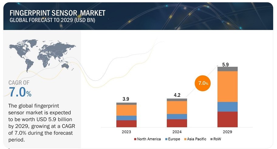 The global fingerprint sensor market size is projected to grow from USD 4.2 billion in 2024 and is expected to reach USD 5.9 billion by 2029, growing at a CAGR of 7.0% from 2024 to 2029. Implementing biometric technology-based time and attendance registering systems has simplified tracking employees’ time and attendance and is driving the market. Fingerprint technology-based systems are user-friendly and easy to install, aiding management in tracking and analyzing employee data. One of their main advantages is preventing employees from logging in for one another, a common issue with older methods like time clocks, sign-in sheets, and ID card swiping. Fingerprint sensors have significantly reduced attendance fraud.
