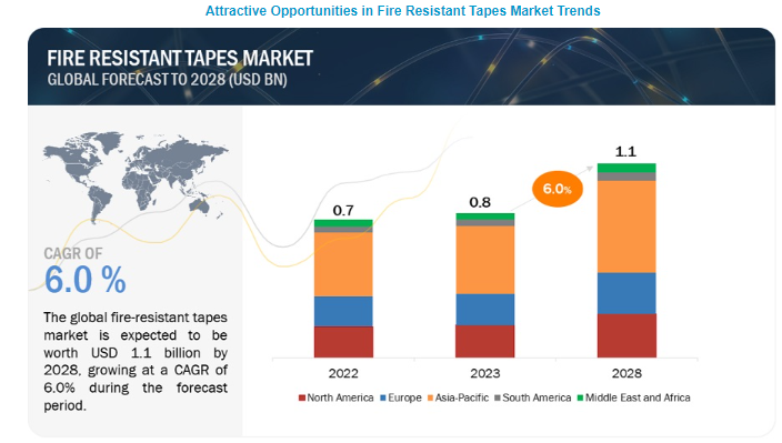 | 내화성 테이프 시장은 2023년에 약 0.8억 달러로 시작하여 2028년까지 11억 달러에 이를 것으로 예상되며, 이 기간 동안 연평균 성장률(CAGR)은 6.0%에 달할 것으로 보입니다. 내화성 테이프는 전기 자동차 및 첨단 전자 제품의 수요 증가로 인해 다양한 산업에서 소비가 촉진되고 있습니다. 이 테이프는 방화벽 역할을 하며, 공공장소 및 밀폐된 공간에서 화재 전파를 방지하고 유해 물질 방출을 방지하는 특수 접착 재료로 설계되었습니다. 시장 동향을 보면, 전기 자동차의 내화성 테이프에 대한 수요가 증가하고 있으며, 이는 전기 자동차의 화재 안전 문제를 해결하는 데 기여하고 있습니다. 그러나 내화성 테이프의 생산에는 높은 가공 및 제조 비용이 발생하며, 이는 제조업체들에게 도전 과제가 됩니다. 또한, 개발도상국의 급속한 산업화는 내화성 테이프 시장에 중요한 기회를 제공하고 있으며, 화재 안전 솔루션에 대한 수요가 증가하고 있습니다. 친환경 내화성 테이프에 대한 수요도 증가하고 있으며, 제조업체들은 지속 가능한 재료와 생산 방법을 모색하고 있습니다. 내화성 테이프는 자동차 산업에서 중요한 역할을 하며, 특히 전기 및 하이브리드 차량의 안전성을 높이는 데 사용됩니다. 다양한 최종 사용 산업에서 내화성 테이프는 주요한 요구사항으로 자리 잡고 있으며, 시장은 아시아 태평양 지역이 가장 큰 시장 점유율을 차지할 것으로 예상됩니다. 전 세계적인 내화성 테이프 시장은 3M, 스카파 그룹, 에이버리데니슨 등 여러 글로벌 기업들이 주도하고 있으며, 이들은 신제품 개발 및 계약 체결을 통해 시장 점유율을 확대하고 있습니다. 최근에는 Shurtape Technologies가 새로운 제조 공장을 열고 Pro Tapes & Specialties를 인수하는 등의 전략적 결정을 내리며 시장에서의 입지를 강화하고 있습니다. 결론적으로, 내화성 테이프 시장은 전기 자동차 및 전자 제품의 수요 증가, 개발도상국의 산업화, 친환경 제품에 대한 관심 증가 등으로 인해 성장 가능성이 크지만, 높은 제조 비용과 같은 도전 과제도 존재합니다. |