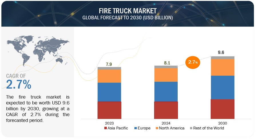 [269페이지 보고서] 전 세계 소방차 시장은 2024년 81억 달러에서 2030년 96억 달러로 2.7%의 연평균 성장률(CAGR)로 성장할 것으로 예상됩니다. 소방차 시장을 이끄는 주요 요인으로는 엄격한 소방 안전법, 도시화 및 인프라 개발 증가, 석유 및 가스 산업 부문의 성장이 꼽힙니다. 이러한 수요는 소방서의 최신 소방차 구매를 위한 정부의 투자에 의해 더욱 촉진되고 있습니다. 또한 신흥 지역의 경제 성장으로 인한 노후 소방차 교체도 주요 원인입니다. 비상 대응 및 재난 관리에 대한 강조가 증가하고 화재 안전에 대한 대중의 지식이 높아진 것도 시장 확대에 기여하고 있습니다.
