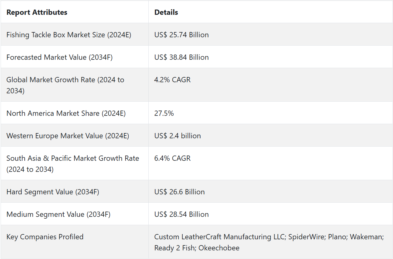 전 세계 낚시 태클 박스 시장은 2024년에 미화 257억 4천만 달러의 가치를 달성할 것으로 분석되며, 이후 4.2%의 연평균 성장률로 2034년 말까지 미화 388억 4천만 달러의 가치를 달성할 것으로 예상됩니다.