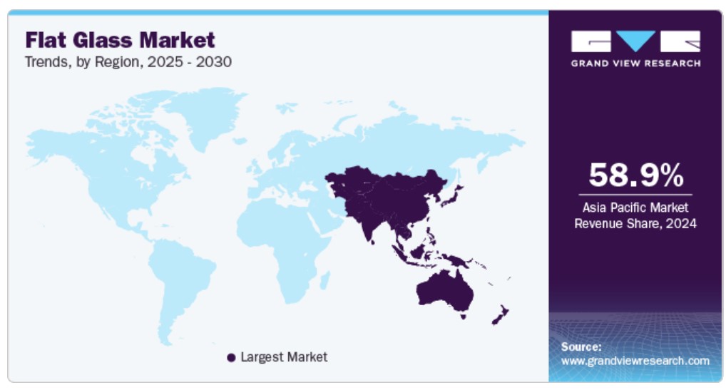 아시아 태평양은 2024년 58.9%의 가장 큰 매출 점유율로 평면 유리 시장을 지배했습니다. 이 지역의 건설 활동 증가와 주거 및 비주거용 건축물에서의 유리 기반 건축물 사용 증가로 인해, 특히 이 지역의 신흥 경제국에서 평면 유리 수요가 더욱 증가할 것으로 보입니다. 급속한 경제 성장, 가처분 소득 증가, 그에 따른 주거용 주택 및 태양광 설치 수요 증가와 같은 요인이 이 지역의 평면 유리 수요에 도움이 될 것으로 예상됩니다.