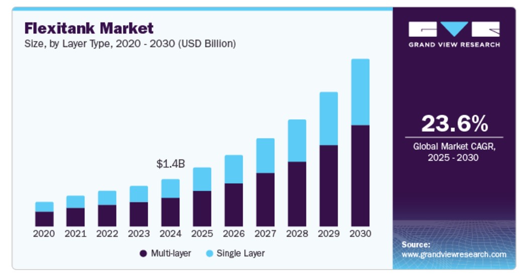전 세계 플렉시탱크 시장 규모는 2024년 1,357.3억 달러로 추정되며 2025년부터 2030년까지 23.6%의 연평균 성장률을 보일 것으로 예상됩니다. 이 시장은 전 세계적으로 증가하는 상품 교역량으로 인해 상당한 성장을 경험하고 있습니다. 국제 무역이 확대됨에 따라 벌크 액체를 위한 효율적인 운송 솔루션에 대한 수요가 증가하면서 플렉시탱크가 선호되고 있습니다.