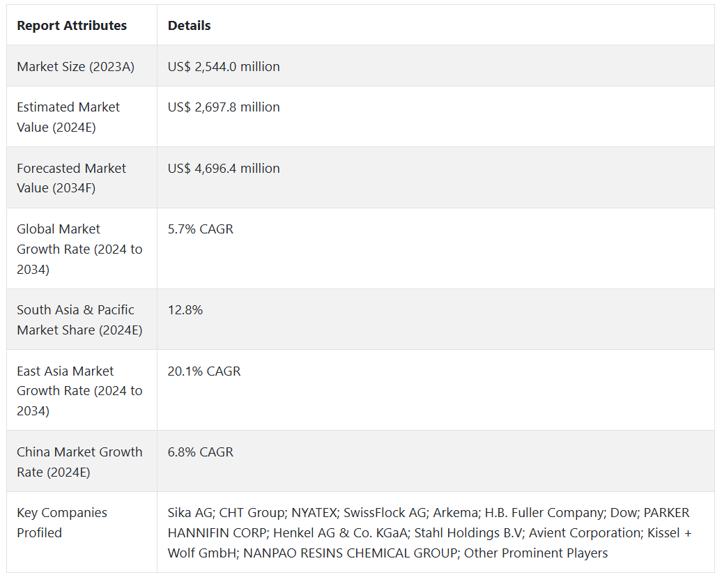 2034년까지 폴리우레탄 수지 유형의 플록 접착제 판매는 6.1%의 주목할 만한 CAGR로 증가할 것으로 예상됩니다.