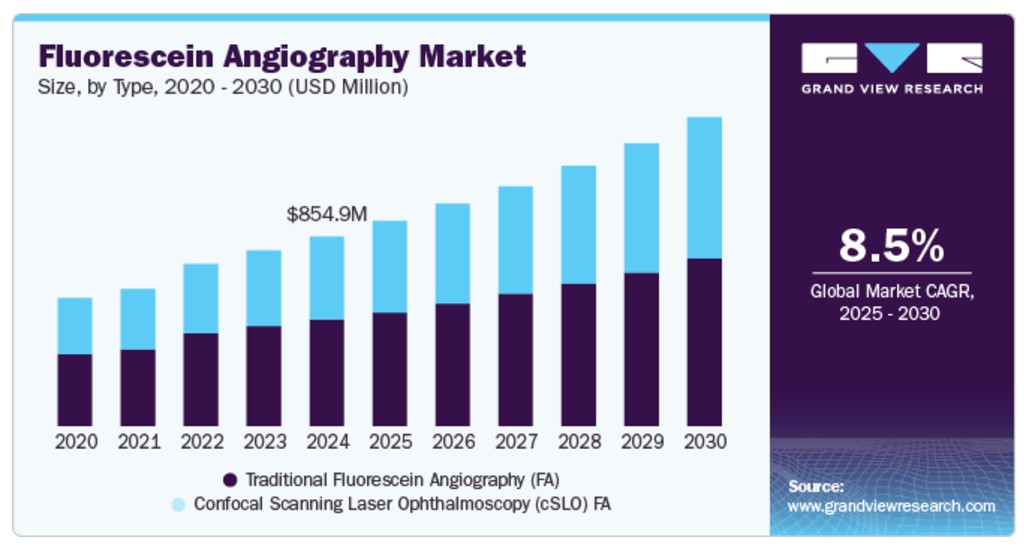 글로벌 플루오레세인 혈관조영술 시장 규모는 2024년에 8억 5,490만 달러로 평가되었으며 2025년부터 2030년까지 8.5%의 연평균 성장률을 보일 것으로 예상됩니다. 이러한 성장은 안과 질환, 특히 당뇨병성 망막증과 황반변성의 유병률 증가에 기인합니다. 또한 조기 진단에 대한 수요와 디지털 안저 카메라와 같은 이미징 기술의 발전으로 진단 정확도가 향상되었습니다. 또한 실명 감소와 인식 제고를 위한 정부의 이니셔티브도 시장 확대에 기여하고 있습니다. 또한 전 세계적으로 인구 고령화가 진행되면서 이러한 진단 절차의 필요성이 더욱 커질 것으로 예상됩니다.