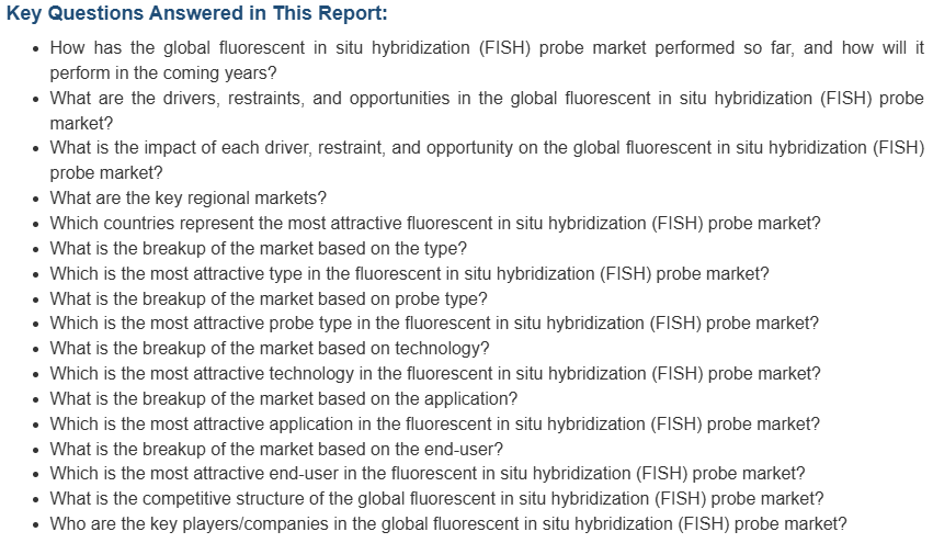 개인 맞춤 의학에 대한 수요가 증가함에 따라 FISH 프로브의 도입이 촉진되고 있습니다. FISH 프로브는 개별 환자의 유전적 프로파일에 대한 귀중한 통찰력을 제공하여 특정 유전적 변이를 기반으로 맞춤형 치료 전략을 가능하게 합니다. 또한, 임상의와 연구자들이 유전적 이상에 대한 고해상도의 시각적, 정량적 정보를 제공하기 위해 FISH 프로브를 광범위하게 활용함에 따라 시장 성장에 박차를 가하고 있습니다. 또한, 여러 정부에서 첨단 진단 검사를 받은 환자에게 비용을 보상하고 고품질 의료 시설에 대한 접근을 제공하기 위한 지원 정책을 시행함으로써 시장 성장에 박차를 가하고 있습니다. 고령 인구 증가, 의료 산업의 급속한 확장, 광범위한 연구 개발(R&D) 활동, 표적 치료에 대한 관심 증가, 첨단 FISH 프로브 개발에 대한 투자 증가를 비롯한 다른 요인들도 시장 성장을 견인할 것으로 예상됩니다.