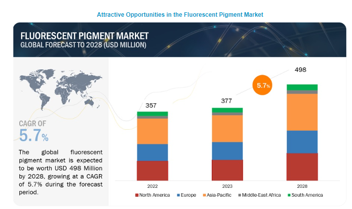 형광 안료 시장은 2023년 3억 7,700만 달러에서 5.7%의 연평균 성장률로 2028년에는 4억 9,800만 달러에 달할 것으로 예상됩니다. 형광 안료 시장은 다양한 산업 분야의 수요 증가로 인해 역동적이고 다양한 환경이 특징입니다. 자외선(UV)에 노출되면 가시광선을 방출하는 것으로 알려진 이 안료는 보안 및 화폐, 포장, 자동차 및 운송, 건축 및 건설, 섬유, 화장품 등의 분야에서 광범위하게 사용되고 있습니다. 보안 분야에서 형광 안료는 위조 방지 조치에 중요한 역할을 하며 화폐와 중요 문서에 진위성을 부여합니다. 포장 산업에서는 라벨과 포장재의 시각적 매력을 높여 시선을 사로잡는 형광 안료의 특성을 높이 평가합니다. 자동차 및 운송 분야에서는 안전 및 미적 목적을 위해 눈에 잘 띄는 코팅에 형광 안료를 사용하며, 건축 및 건설 분야에서는 안전 표시 및 장식 요소에 형광 안료를 사용합니다. 섬유 산업은 형광 안료가 직물에 생동감을 부여하여 트렌디하고 세련된 제품에 대한 수요를 충족시키는 이점을 누리고 있습니다. 또한 형광 안료는 화장품 산업에서 대담하고 생생한 색상을 구현하기 위해 널리 사용되고 있습니다. 형광 안료 시장은 다양한 미적 및 기능적 요구 사항을 충족하는 다양한 응용 분야와 능력으로 다양한 산업에서 시각적 환경을 형성하는 데 중추적인 역할을 계속하고 있습니다.