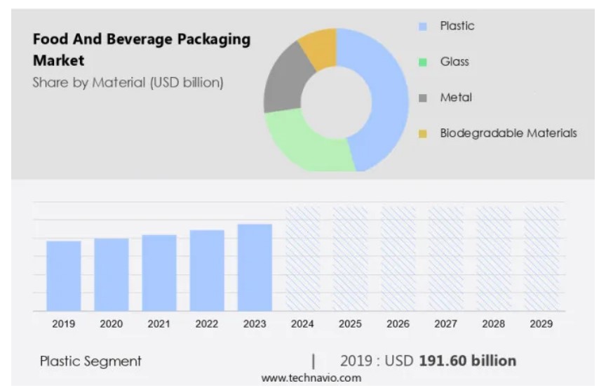 이 시장은 다양한 용도, 내구성, 비용 효율성 때문에 다양한 종류의 플라스틱 소재를 활용합니다. 주목할 만한 플라스틱으로는 폴리에틸렌(PE), 폴리에틸렌 테레프탈레이트(PET), 폴리프로필렌(PP), 폴리스티렌(PS) 등이 있습니다. PE, 특히 저밀도 폴리에틸렌(LDPE)과 고밀도 폴리에틸렌(HDPE)이 널리 사용됩니다. DPE는 유연성 때문에 선호되며, 신선한 농산물을 담는 가방이나 영화에 주로 사용됩니다. 반면, HDPE의 강도는 우유나 주스 같은 용기에 적합합니다. PET는 또 다른 중요한 소재로, 주로 음료 산업에서 사용됩니다.