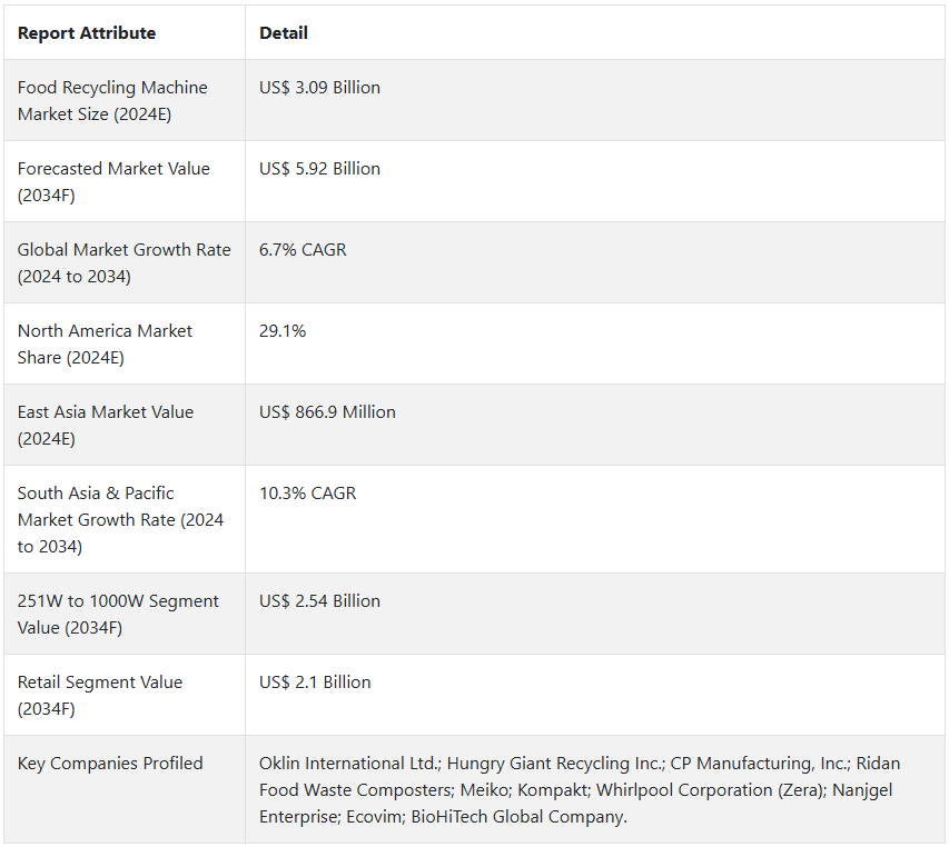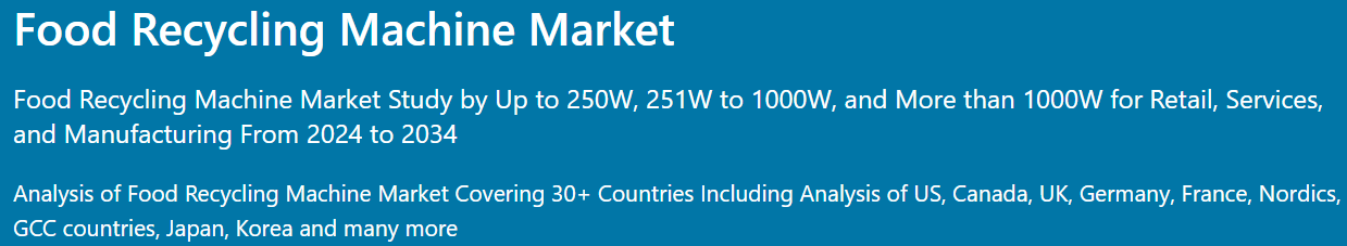 Fact.MR이 발표한 새로운 연구 보고서에 따르면, 2024년 전 세계 음식물 재활용 기계 시장 규모는 미화 30억 9천만 달러에 이를 것으로 분석됩니다. 수요는 연평균 6.7%의 성장률을 보이며 2034년 말에는 미화 59억 2천만 달러에 이를 것으로 예상됩니다.