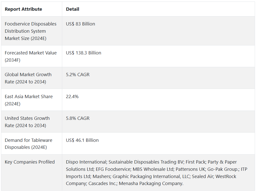 식품 서비스 일회용품 유통 시스템에 대한 수요는 2024년부터 2034년까지 연평균 5.2%의 성장률로 증가할 것으로 분석됩니다.