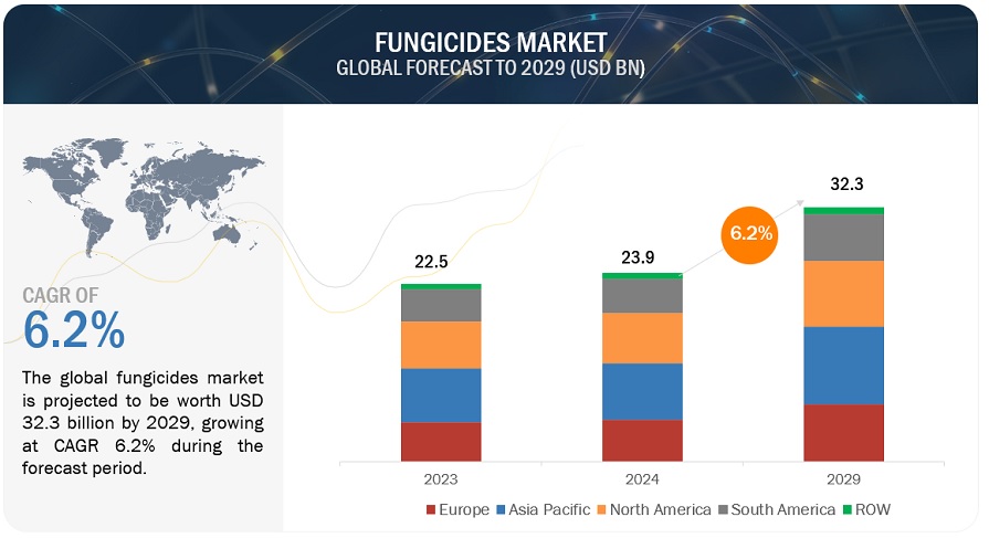 [328페이지 보고서]에 따르면 살균제 시장은 2024년 239억 달러에서 2029년 323억 달러에 달할 것으로 예상되며, 예측 기간 동안 금액 기준으로 6.2%의 연평균 성장률(CAGR)을 기록할 것으로 전망됩니다. 전 세계 살균제 시장은 효과적인 작물 보호 솔루션을 필요로 하는 전 세계 인구 증가에 따라 높은 농장 수확량에 대한 수요가 빠르게 증가함에 따라 성장하고 있습니다. 기후 변화의 심화로 인해 곰팡이 질병의 발생 범위가 넓어지면서 살균제 수요가 더욱 증가하고 있습니다. 살균제의 제형과 살포 기술의 발전으로 효율성이 향상되었습니다. 지속 가능한 농업에 대한 인식이 높아지고 개발도상국에서 농업 활동이 증가하는 것도 시장 증가에 기여하는 또 다른 요인입니다. 이러한 모든 요인이 함께 전 세계적으로 혁신적이고 적절한 광범위 살균제 솔루션에 대한 수요를 증가시키고 있습니다.