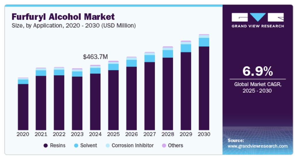 전 세계 푸르푸릴 알코올 시장 규모는 2024년 4억 6,370만 달러로 추정되며 2025년부터 2030년까지 6.9%의 연평균 성장률(CAGR)로 성장할 것으로 예상됩니다. 이러한 성장은 다양한 산업, 특히 파운드리 응용 분야에서 수요가 증가하고 친환경 수지의 생산이 주요 촉매제 역할을 하고 있기 때문입니다. 또한 지속 가능한 관행으로의 전환과 사탕수수 사탕수수와 옥수수 속대와 같은 재생 가능한 농업 부산물을 사용하는 것도 그 매력을 높여줍니다. 또한 제약 부문에서 중간체 합성을 위해 푸르푸릴 알코올의 사용이 증가하면서 시장 확대가 더욱 가속화되고 있습니다. 이러한 산업 수요와 지속 가능성 트렌드의 결합으로 푸르푸릴 알코올은 다양한 응용 분야에서 중요한 위치를 차지하고 있습니다.