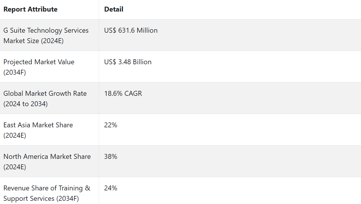 Fact.MR은 이 업데이트된 시장 보고서에서 전 세계에 위치한 G 스위트 기술 서비스 시장의 주요 업체들의 가격대, 매출 성장, 생산 능력, 투기적 기술 확장에 대한 자세한 정보를 제공합니다.