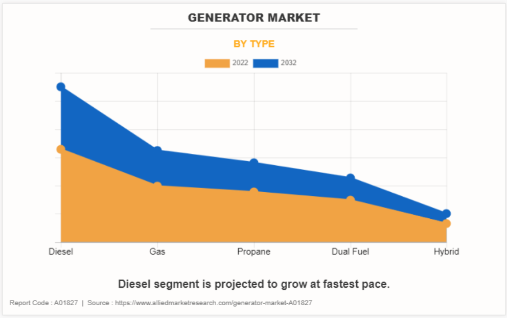 유형별로 발전기 시장 규모는 디젤, 가스, 프로판, 이중 연료, 하이브리드로 나뉩니다. 디젤 부문은 시장 성장을 주도했으며, 전망 연도 동안 더 빠른 속도로 성장할 것으로 예상되어 발전기 시장 성장에 기여할 것으로 보입니다. 디젤 연료는 발전기에 사용되며 효율성이 높기 때문에 주로 발전에 사용됩니다. 안정적인 백업 전력 솔루션에 대한 필요성은 특히 불안정한 전력망이 있는 지역이나 자연 재해가 발생하기 쉬운 지역에서 디젤 발전기 시장을 계속해서 견인하고 있습니다. 의료, 데이터 센터, 제조, 통신과 같은 산업은 종종 디젤 발전기로 공급되는 백업 전력원에 의존합니다.