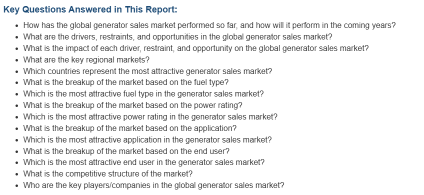 시장 조사 보고서는 또한 시장의 경쟁 구도에 대한 포괄적인 분석을 제공합니다. 모든 주요 기업의 상세한 프로필도 제공됩니다. 발전기 판매 업계의 주요 시장 참여 기업으로는 ABB Ltd., Atlas Copco AB, Bharat Heavy Electricals Limited, Briggs & Stratton Corporation, Caterpillar Inc., Cummins Inc., Generac Power Systems Inc., General Electric Company, Kohler Co., Mitsubishi Heavy Industries Ltd., Rolls-Royce plc, Siemens AG, Toshiba Corporation, Wacker Neuson SE, Wärtsilä Corporation 등이 있습니다.