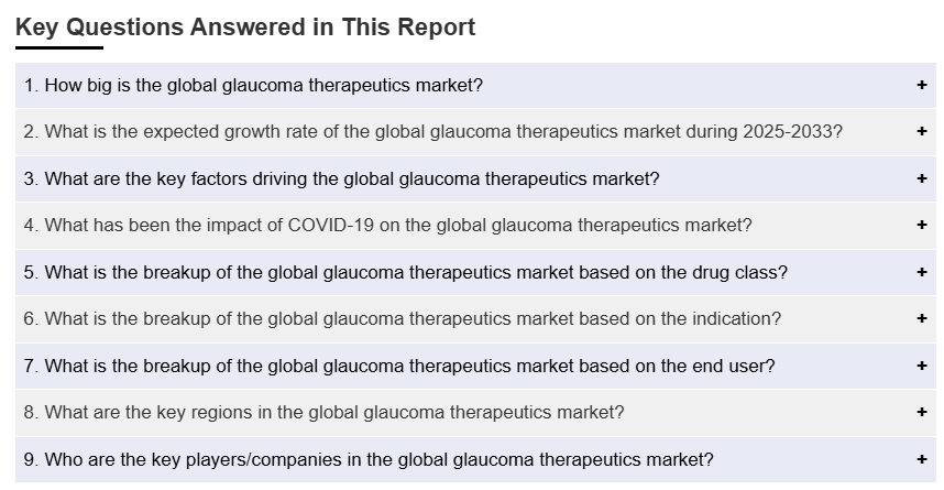 IMARC 그룹은 2025-2033 년 글로벌, 지역 및 국가 수준의 예측과 함께 글로벌 녹내장 치료제 시장 보고서의 각 부문의 주요 동향에 대한 분석을 제공합니다. 이 보고서는 약물 클래스, 적응증 및 최종 사용자를 기준으로 시장을 분류했습니다.