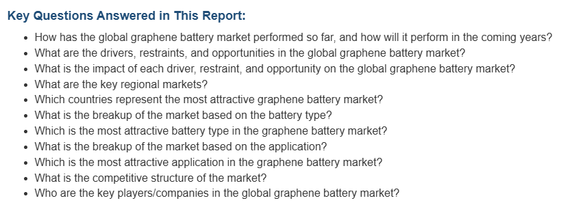 시장 조사 보고서는 또한 시장의 경쟁 구도에 대한 포괄적인 분석을 제공합니다. 모든 주요 기업에 대한 자세한 프로필도 제공됩니다. 그래핀 배터리 업계의 주요 시장 참여 기업으로는 Cabot Corporation, Elcora Advanced Materials Corp., Global Graphene Group, Graphenano s.l., Graphene Batteries AS, Hybrid Kinetic Group Limited, Nanotech Energy Inc. 및 XG Sciences Inc. 등이 있습니다.