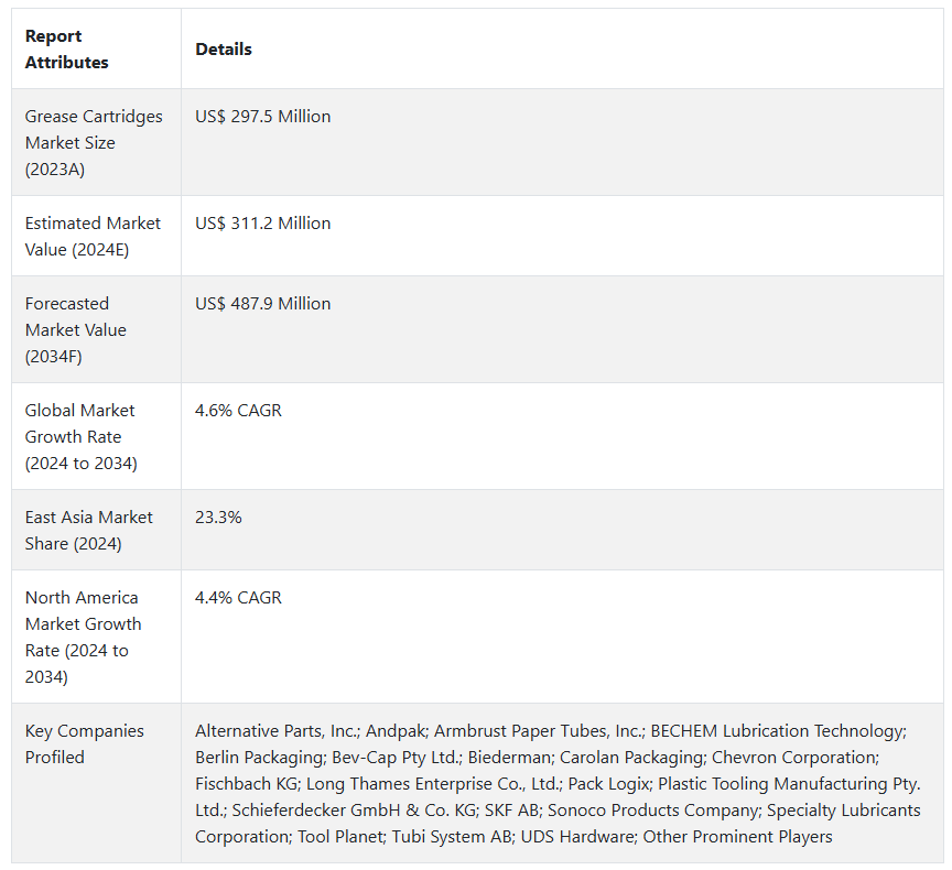 글로벌 그리스 카트리지 시장은 2024년에 미화 3억 1,120만 달러에 달할 것으로 예상되며, 2034년에는 미화 4억 8,790만 달러로 증가하여 2024년부터 2034년까지 연평균 4.6%의 성장률을 보일 것으로 예상됩니다.