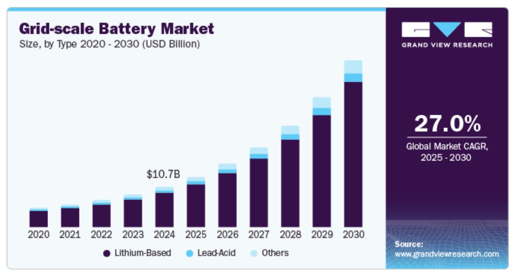 글로벌 그리드 스케일 배터리 저장 시장 규모는 2024년 107억 달러로 추정되었으며, 2025년부터 2030년까지 연평균 27.0% 성장할 것으로 예상됩니다. 이러한 성장은 태양광과 풍력 같은 재생 가능 에너지의 보급이 증가함에 따라 수요와 공급의 변동성을 관리하기 위한 효과적인 에너지 저장 솔루션이 필요하게 되었기 때문입니다. 또한, 그리드 스케일 배터리는 생산량이 가장 많은 시간대에 잉여 에너지를 저장했다가 수요가 많은 시간에 방출함으로써 그리드의 안정성을 향상시킵니다. 게다가, 배터리 기술, 특히 리튬 이온 배터리의 발전으로 효율성이 향상되고 비용이 절감되어, 화석 연료에서 벗어나려는 공공 시설에서 이러한 시스템을 더 많이 사용할 수 있게 되었습니다.