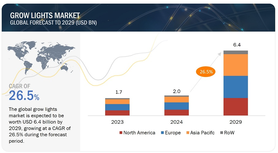 The grow lights market is expected to reach USD 6.4 billion by 2029 from USD 2.0 billion in 2024, at a CAGR of 26.5% during the 2024-2029 period.