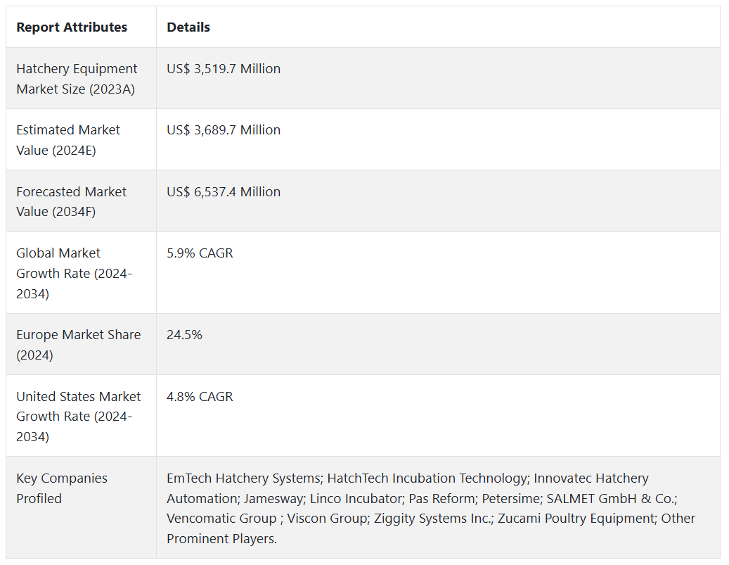 앞서 언급한 사실에 근거하여, 시장 조사 및 경쟁 정보 제공 업체인 Fact.MR에 따르면 부화장 장비 시장은 2024-2034년 예측 기간 동안 연평균 5.9%의 성장률을 보일 것으로 예상됩니다.