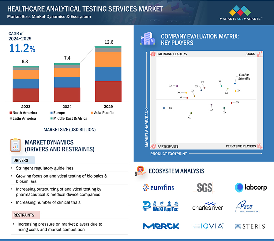 헬스케어 분석 테스트 서비스 시장은 2023년 74억 달러에서 2029년에는 126억 달러에 달할 것으로 예상되며, 예측 기간 동안 11.2%의 CAGR로 성장할 것으로 전망됩니다. 테스트 아웃소싱에 대한 선호도 증가, 엄격한 규제 요건, 임상시험 증가, R&D 투자 증가가 이 시장의 성장을 주도하고 있습니다.