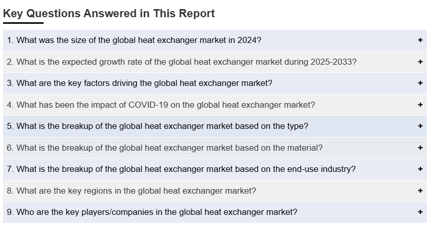 IMARC 그룹은 2025-2033년 글로벌, 지역, 국가 수준의 예측과 함께 글로벌 열교환기 시장 보고서의 각 세그먼트에 대한 주요 트렌드 분석을 제공합니다. 저희 보고서는 유형, 재료, 최종 사용 산업을 기준으로 시장을 분류했습니다.