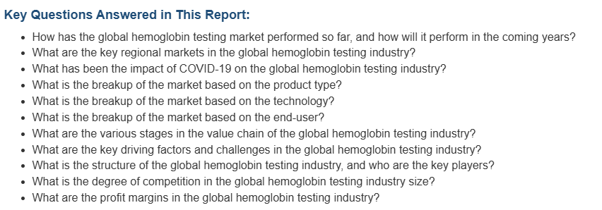주요 시장 동인: 의료 시스템 개선, 의료 서비스에 대한 연간 지출 증가, 혈액 관련 질병에 대한 인식 제고, 기술 발전 등이 헤모글로빈 검사 시장의 성장 동인입니다.