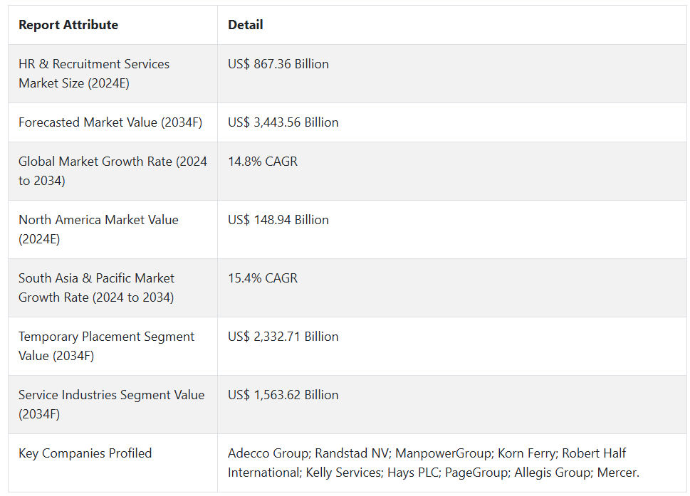 Fact.MR이 발표한 새로운 연구 보고서에 따르면, 글로벌 HR & 채용 서비스 시장은 2024년에 미화 8,673억 6천만 달러에 달할 것으로 추정됩니다. 수요는 2034년 말까지 14.8%의 놀라운 CAGR로 증가하여 미화 3조 4,435억 6천만 달러에 이를 것으로 예상됩니다.