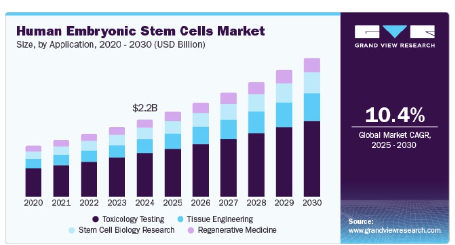 전 세계 인간 배아 줄기세포 시장 규모는 2024년에 22억 달러로 추산되었으며, 2025년부터 2030년까지 연평균 10.44%의 성장률을 보일 것으로 예상됩니다. 줄기세포에 대한 수요가 높은 이유는 주로 만성 질환과 악성 질환의 유병률이 증가하고 있기 때문입니다. 재생의학 및 줄기세포 치료에 대한 지속적인 연구는 노화 관련 질병에 대한 재생 치료에 대한 수요를 촉진했습니다. 또한, 암 연구와 악성 종양 치료를 위한 줄기세포 치료에 대한 정부의 지원은 시장 상황에 긍정적인 영향을 미칩니다.